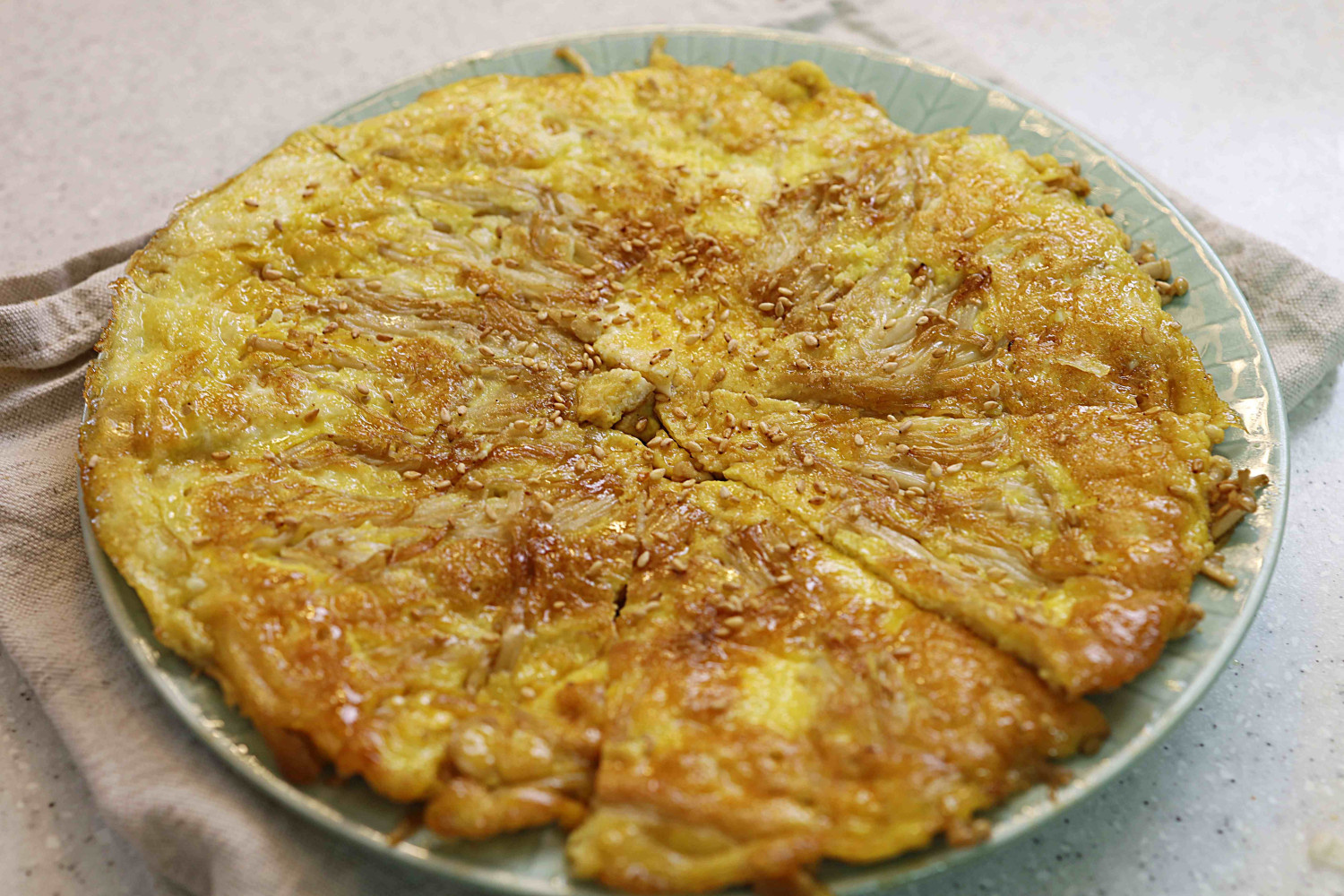 えのき茸の上に、溶き卵を広げて丁寧に流し込み、隙間なく満たします。卵の縁が固まり始めたら、スプーンやヘラを使ってえのき茸を中央に集めるようにそっと寄せます。底面がきつね色に焼け、卵が半熟状になったら、フライ返しを使って慎重に裏返し、反対側も均一に焼き色がつくまで火を通します。(火が強すぎると卵が焦げ付いてしまうので、中火〜弱火を保つのがポイントです。)