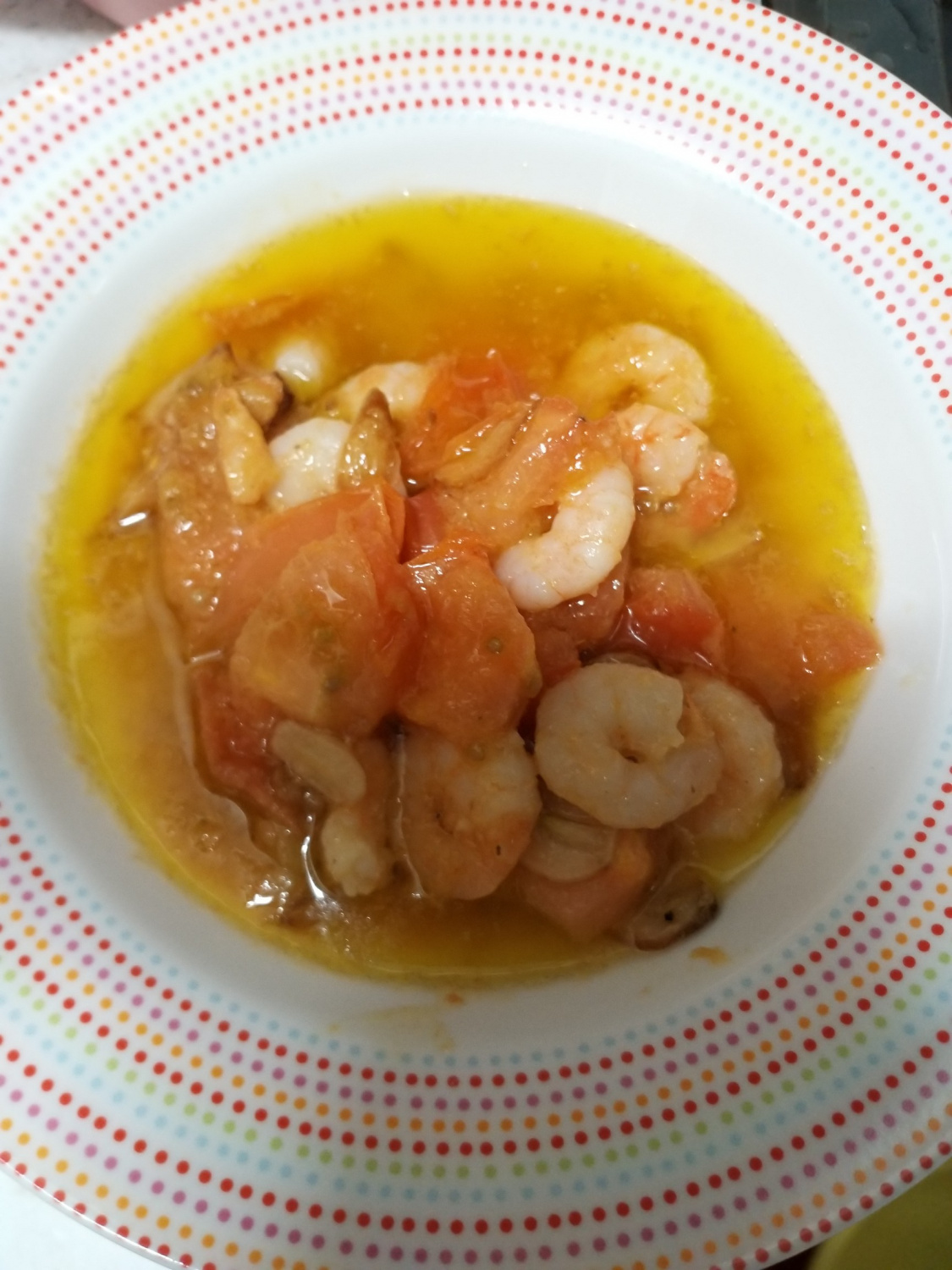 えびが鮮やかなピンク色に変わり、トマトが少し柔らかくなるまで炒めます。この時、味見をしながら塩をひとつまみずつ加えて調整してください。入れすぎるとしょっぱくなるので、味をみながら加減するのがポイントです。具材が馴染み、お好みのとろみがついたら火を止めます。