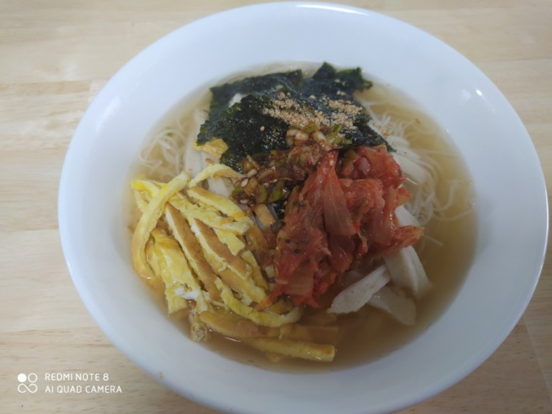 最後に、切った白菜キムチ、刻んだ味付け海苔、そして薄く焼いた卵の錦糸卵を薬味として乗せ、作ったヤンニョムジャンを添えて、よく混ぜて召し上がれ。温かくてボリューム満点のおでんうどん、本当に美味しいですよ!^^