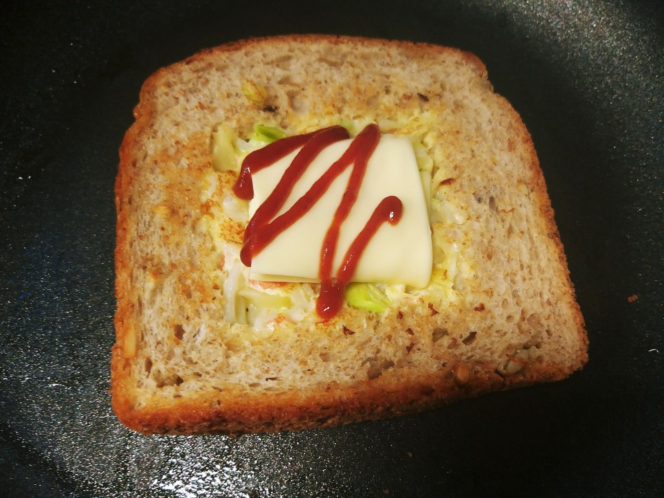 先ほど卵液とキャベツ、カニカマなどを混ぜて作った具材を、食パンの四角い空きスペースにそっと流し込み、満たします。卵液が溢れないように注意しながら、いっぱいに詰めます。中火~弱火で約3~4分、こんがりと焼き色がつくまで焼きます。底面が焼けたら、そっと裏返します。