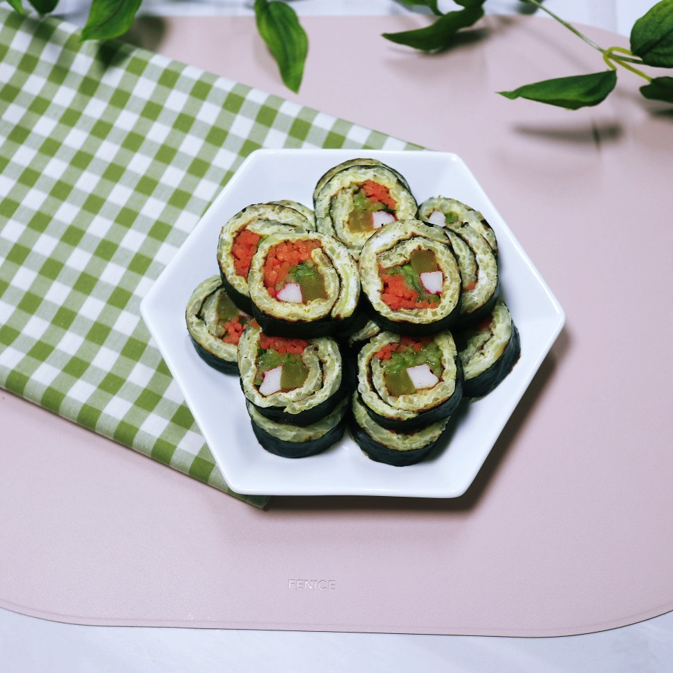 完成したダイエットキンパをお皿にきれいに盛り付ければ、健康的で美味しい食事が準備されます。どうぞ召し上がれ!