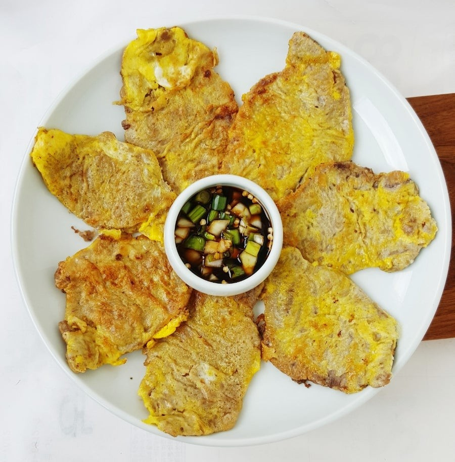 ユクジョンは焼きすぎると硬くなりやすいです。卵の衣がきつね色に焼け、中の牛肉が柔らかく火が通っていれば十分です。カリッと揚げるというよりは、卵の衣をしっかり火に通すことを意識してください。