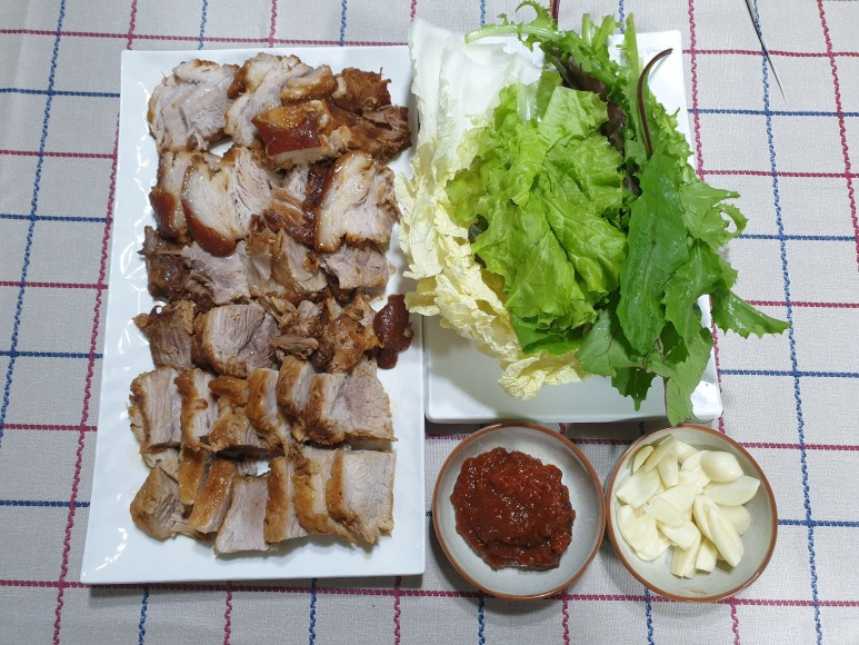 取り出した茹で豚は、粗熱が取れるまで少し冷まします。熱々のうちに切ると崩れやすいので、手で触れるくらいの温度になったら、お好みの厚さにスライスします。薄く切るほど、より一層柔らかさを感じられます。サンチュやエゴマの葉、大根の甘酢漬け、新鮮なキムチなどと一緒に쌈でいただいたり、エビの塩辛(セウジョッ)やサムジャン(合わせ味噌)などを添えて、熱々をぜひお召し上がりください。