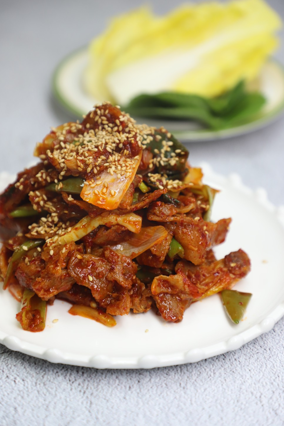 こうして完成した豚肉炒めは、温かいご飯の上にのせて丼にしたり、新鮮なレタスなどの野菜と一緒にサンチュ(包み野菜)で包んで食べると、美味しさが倍増します!サムジャン(韓国の合わせ味噌)やニンニクを添えるのもおすすめです。