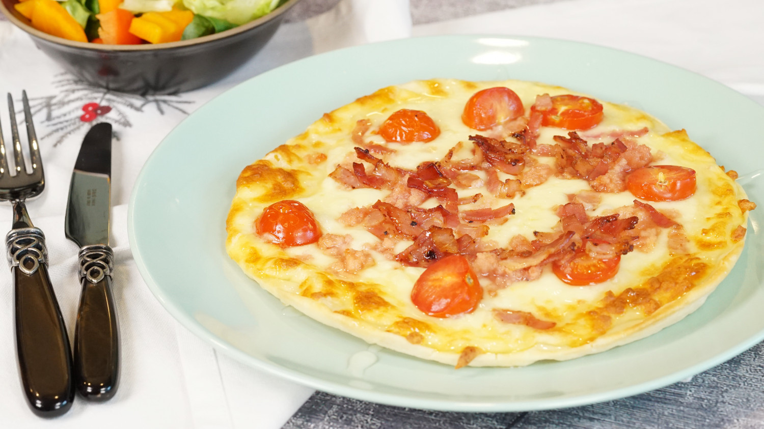 いよいよピザの組み立てです。ピザ生地にクリームソースを均一に広げます。その上からピザ用チーズをたっぷりと乗せて、とろーりチーズを楽しみましょう。最後に、切ったミニトマト、たらこ、そして香ばしく焼いたベーコンを彩りよくトッピングします。
