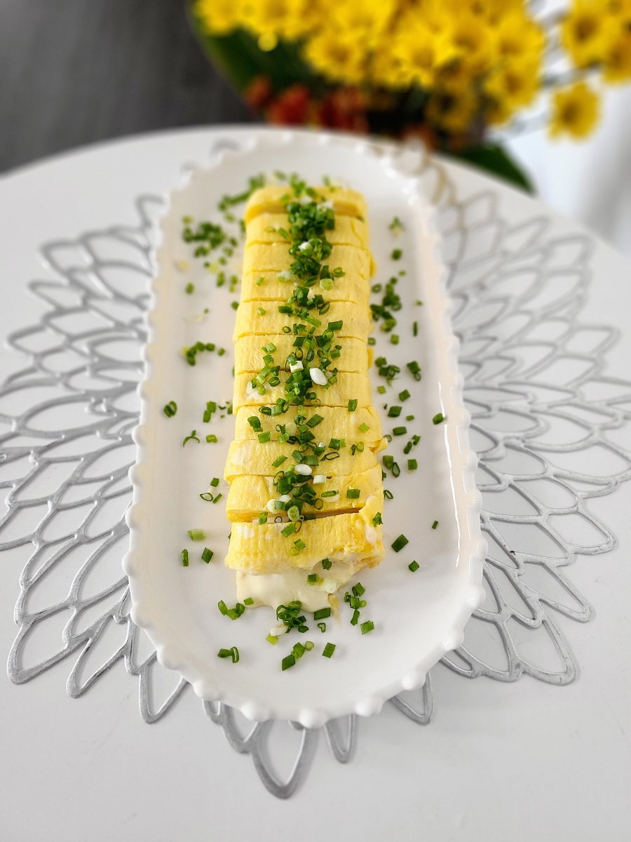 夜、パートナーのためにおつまみとして作ったチーズ入り卵焼きです。作り方、本当に簡単でしょう?テフロン加工のフライパンをよく熱し、弱火で卵液を薄く広げて焼き、軽く固まってきたらくるくると巻いて、巻きすで形を整えて冷ますだけで完了!パン切りナイフや包丁に少し油をつけると、きれいな断面のチーズ入り卵焼きを楽しむことができます。特別な日や、何気ない日にも、美味しい卵焼きで楽しさをプラスしてみてください。