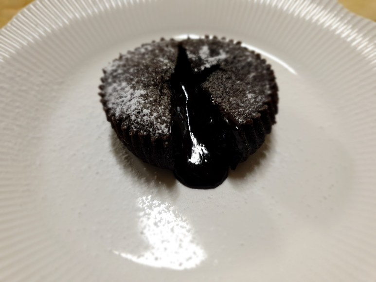 200℃に予熱したオーブンで10分間焼きます。外側は軽く火が通り、中はとろりと溶け出すフォンダンショコラの完成です!オーブンから取り出し、温かい状態のうちに粉砂糖を振ると、さらに見栄えの良いデザートになります。すぐに食べると、最高の美味しさを楽しめますよ!