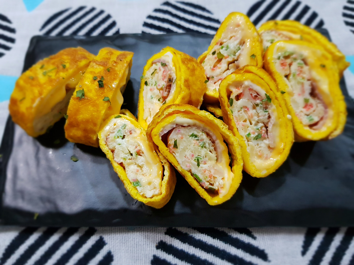 中のチーズがほんのり溶ける程度にさらに加熱したら、卵焼きをフライパンからそっと取り出します。少し冷ましてから、食べやすい大きさに切り、美しいお皿に盛り付ければ、見た目も味も素晴らしい特別な卵焼きの完成です!♥