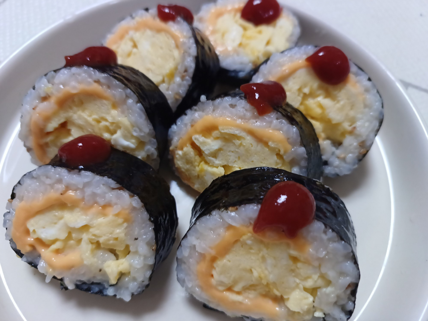 食べやすい大きさにキンパを切り分けます。包丁に油を少しつけたり、濡れ布巾で拭いたりすると、きれいに切ることができます。最後にケチャップを添えてつけながら食べると、甘じょっぱさが絶妙にマッチした、とっても美味しいキンパの完成です!