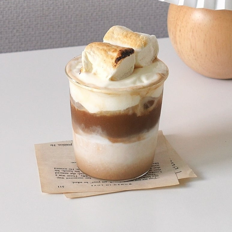 甘くて美味しいマシュマロクリーフラテの完成です!できたての滑らかなクリーム、濃厚なエスプレッソ、そして香ばしく炙ったマシュマロの素晴らしいハーモニーをお楽しみください。