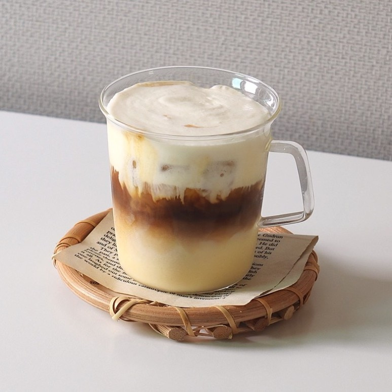 最後に、先ほど作った滑らかなクリームベースを、エスプレッソの層の上にそっとかけます。クリームがミルクとエスプレッソの上に、美しい膜のように浮かび上がってくるはずです。