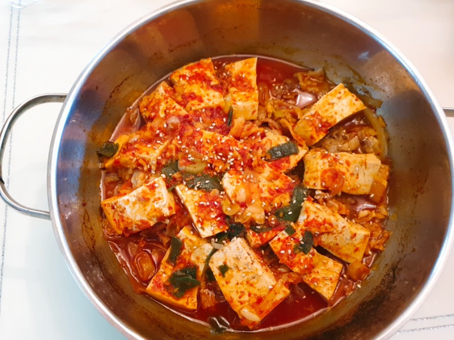 豆腐の上に長ねぎ1掴みを彩りよく乗せたら、あらかじめ作っておいたタレを具材全体に均等にかけます。タレを注ぐ前に、香ばしい風味を加えるえごま油大さじ2を最後に回しかけてください。蓋をして、強火で煮立たせます。ふつふつと沸騰したら、火を中弱火に落とし、具材に火が通り、タレが程よく煮詰まるまでじっくりと煮込んでいきます。