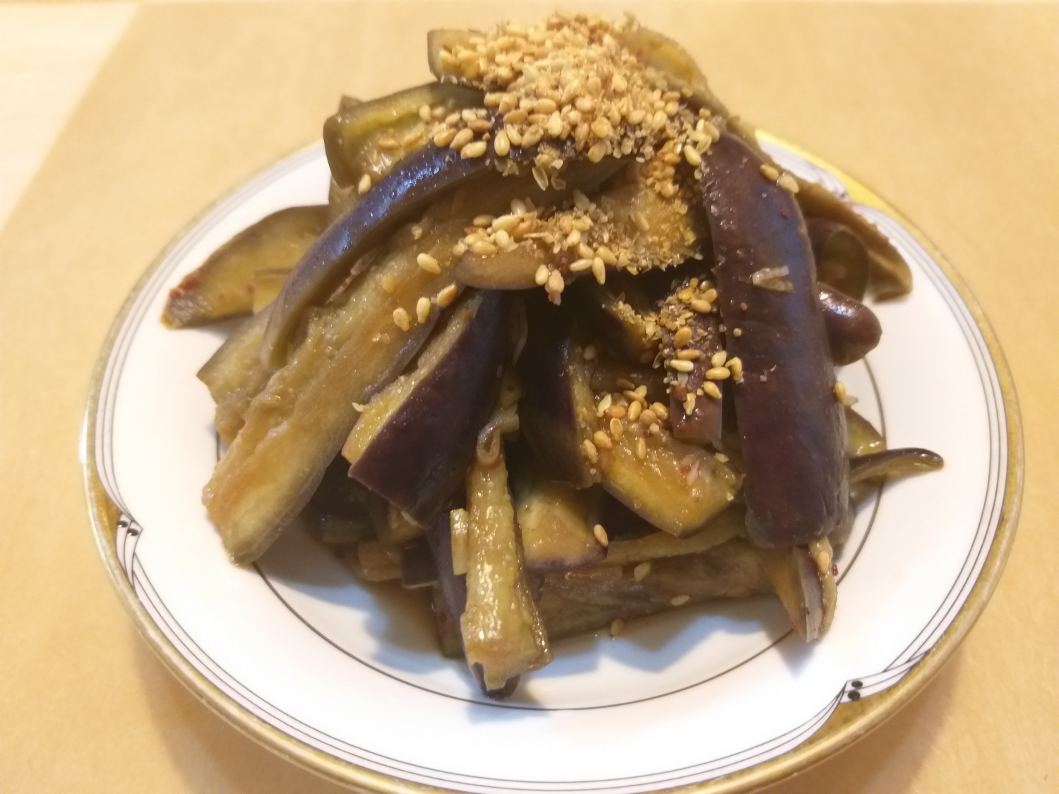 最後に、香ばしいごま油をたっぷり回しかけ、炒りごまをパラパラと振りかけて仕上げます。ごま油と炒りごまの香りが加わり、一層美味しいナスのおひたしが完成します。すぐに食べても美味しいですが、冷蔵庫で冷やして食べても格別な一品です。