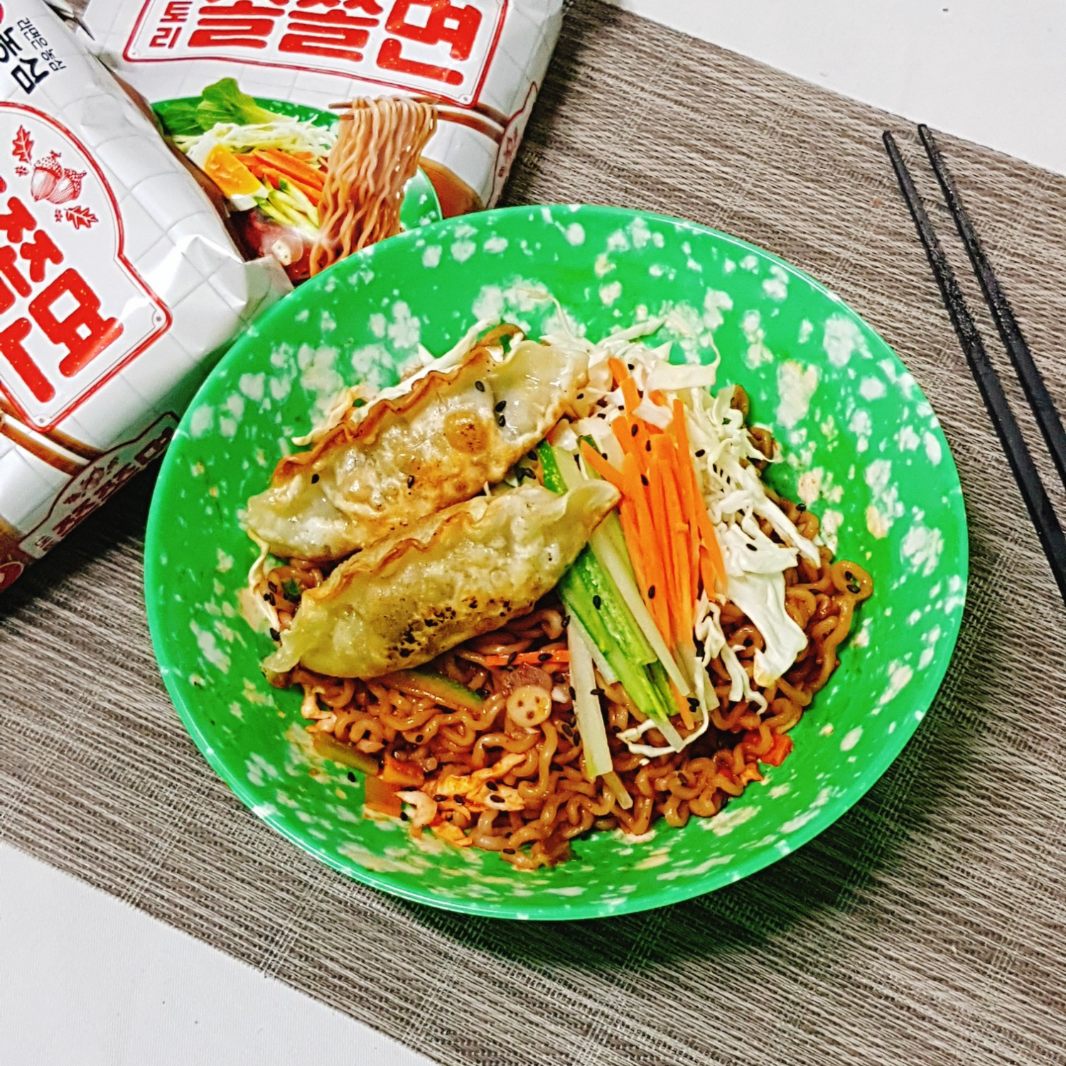 最後に、カリッと焼いた餃子をきれいに盛り付ければ、超簡単&超スピードどんぐりチョルチョル麺ビビンマンドゥの完成です!どうぞ召し上がれ!