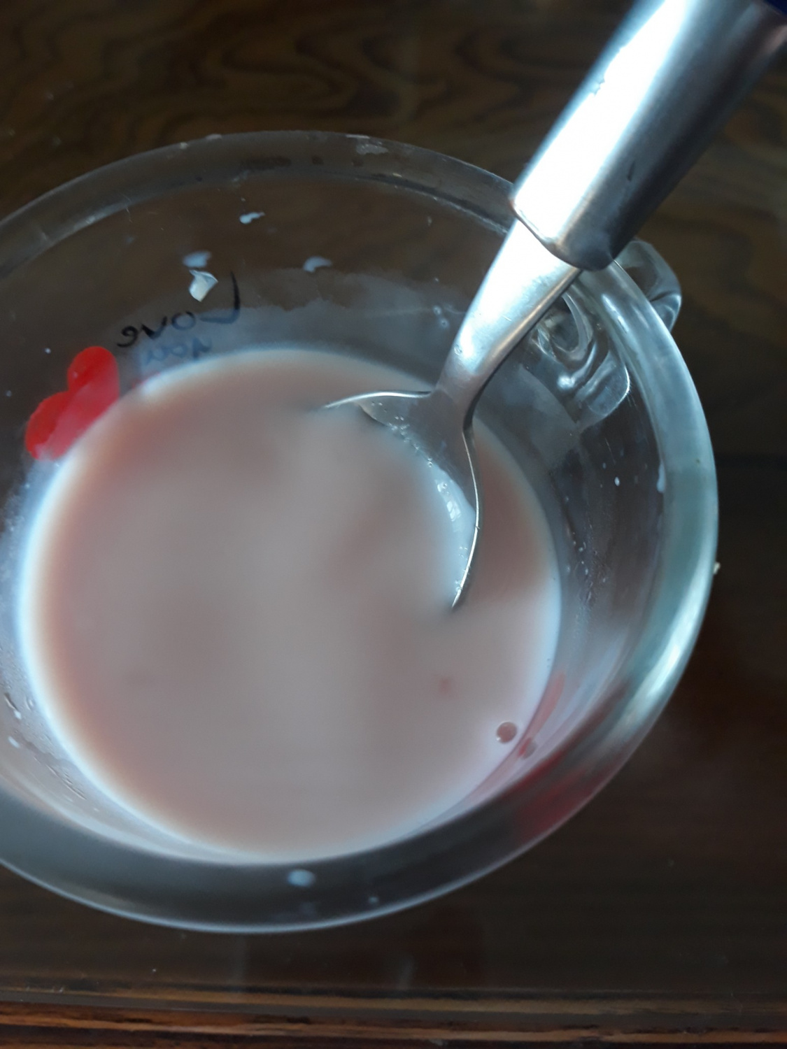 牛乳とスイカが程よく混ざったら、グラスに残った大きなスイカの塊があれば、スプーンなどで取り除いてください。より滑らかな食感を求めるなら、この工程を省略するか、ミキサーで細かく潰してください。