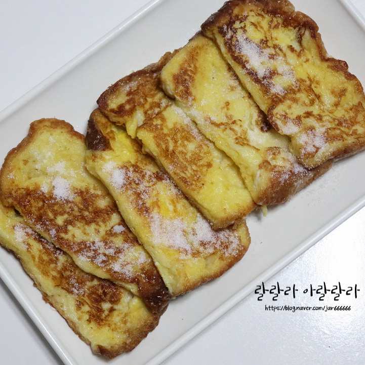 きれいに焼けたらフレンチトーストをお皿に移し、お好みの方法で召し上がってください。お好みで砂糖を振りかけたり、メープルシロップ、はちみつ、フルーツなどを添えても美味しいです。私は甘さを加えるために、砂糖を軽く振りかけました。