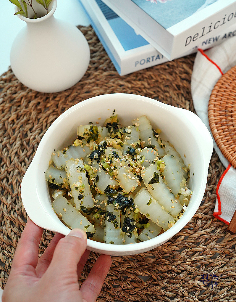 チョンポムク、調味料、海苔のフレークが均一に混ざるように、もう一度全体を優しく和えたら、美味しいチョンポムクの和え物の完成です!