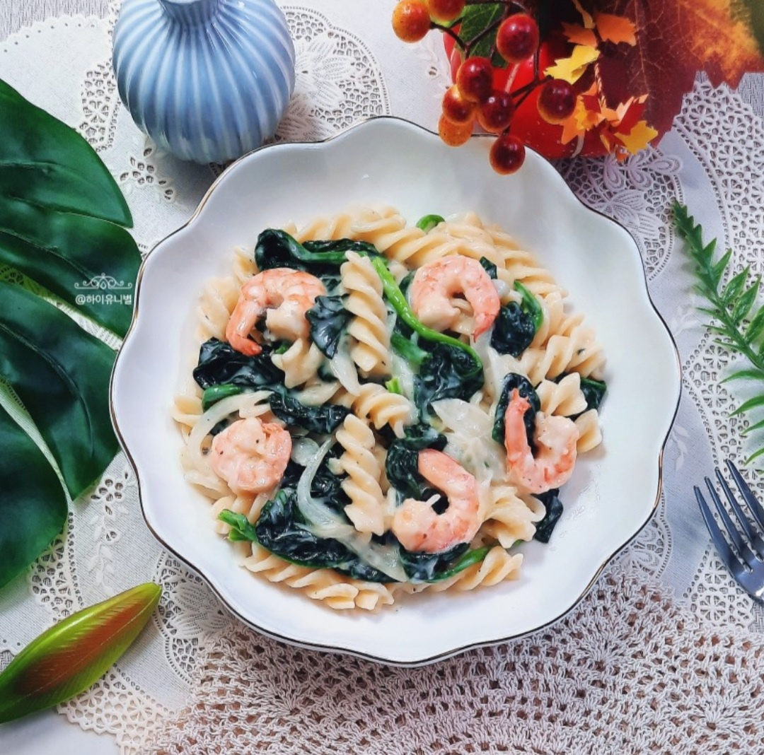 クリーミーなほうれん草とエビのパスタ:ほうれん草とクリームソースの絶妙な組み合わせ!エビを加えて栄養価と風味もアップ!
