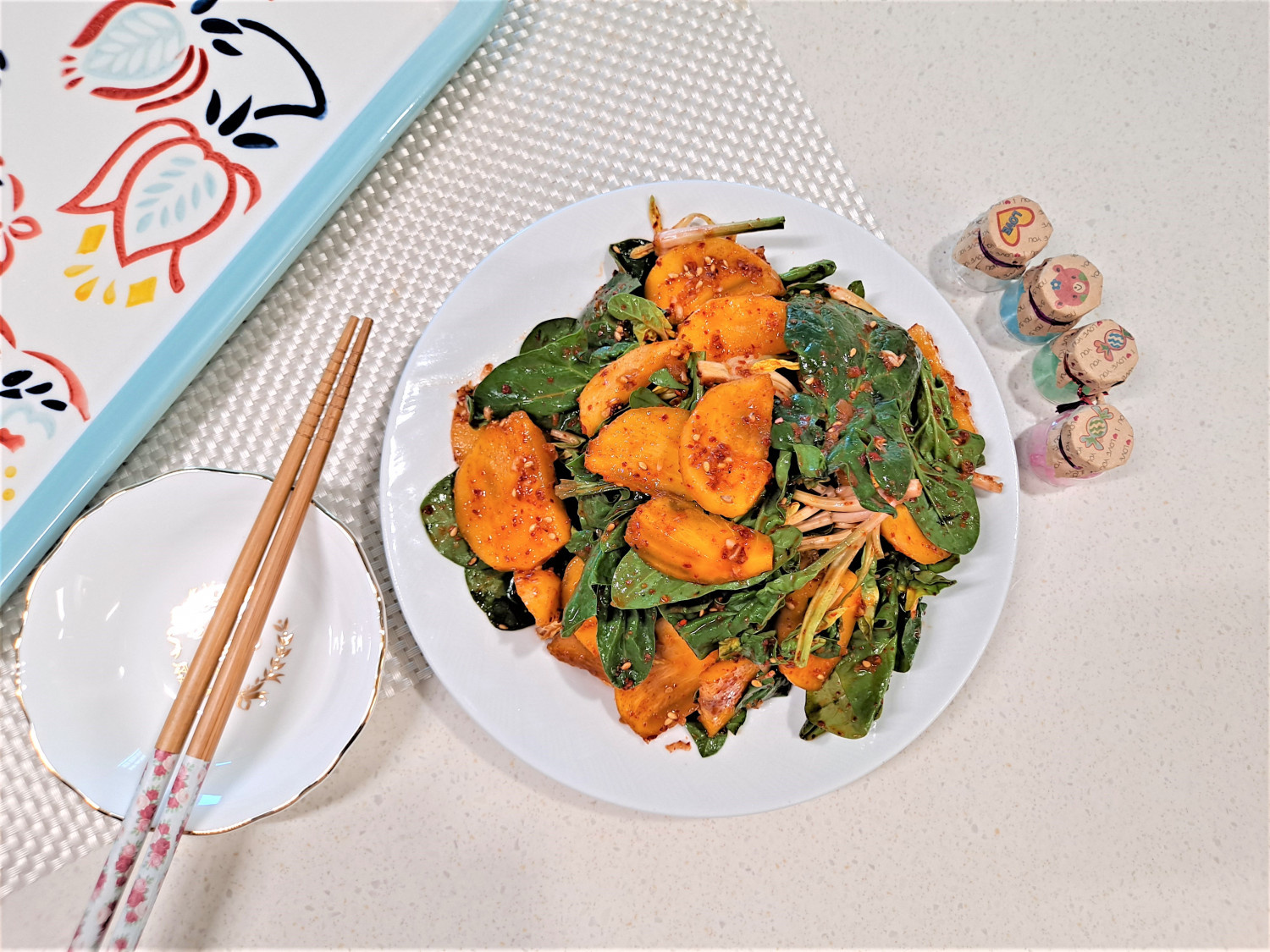 ほうれん草(サムチョ)のフレッシュサラダ、柿の甘さと食感が絶妙