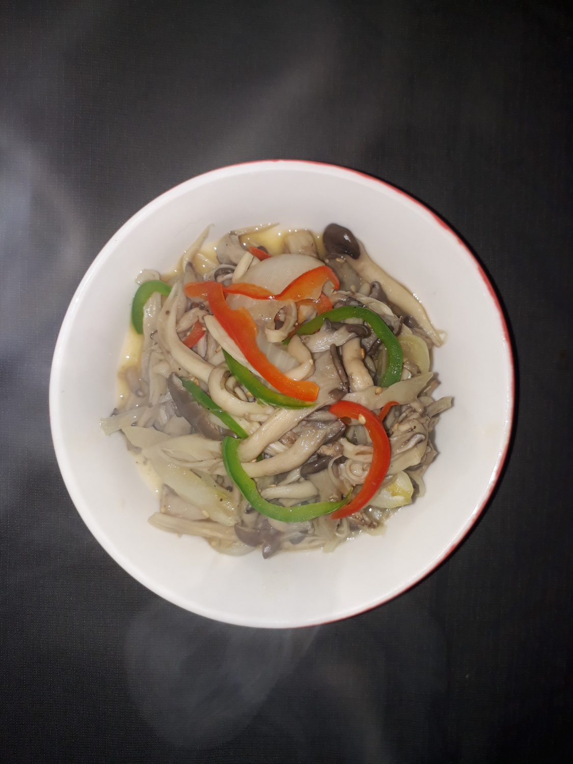 最後に火を止め、準備したピーマンとパプリカを加えて、余熱でさっと混ぜ合わせます。火を通しすぎるとシャキシャキ感が失われるので、強火で短時間だけ混ぜるのがポイントです。最後に白ごま大さじ1を振りかけて香ばしさを加えれば、おいしいヒラタケの炒め物の完成です。