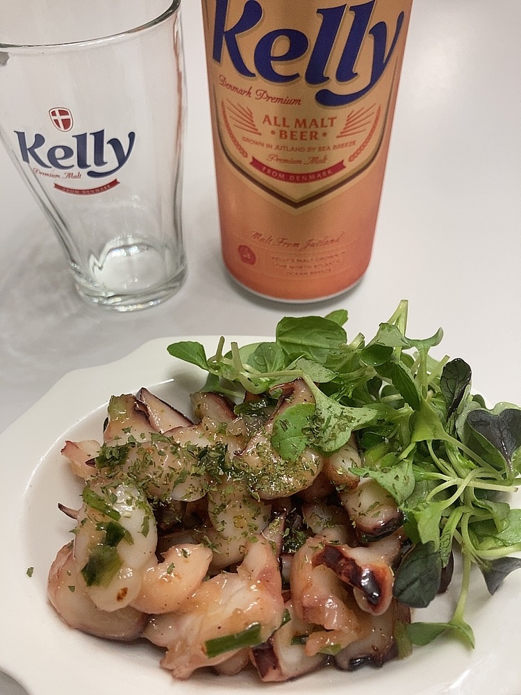 はい、これで簡単なのに本格的なビールのおつまみ、「するめいかの足のバター醤油炒め」の完成です!もちもちとした食感と香ばしい風味がたまりません。冷たいビールと一緒に、ぜひ味わってみてくださいね!どうぞ召し上がれ!