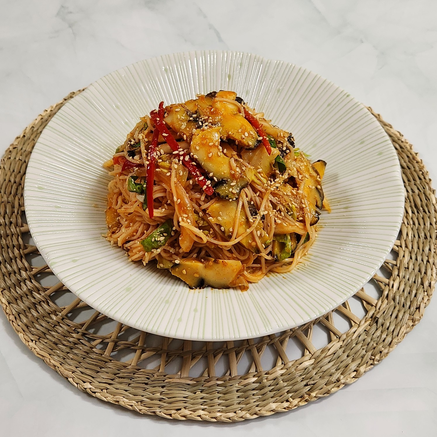 出来上がったピビン麺を、器に盛り付けます。最後に香ばしいいりごまをたっぷり振りかけると、甘酸っぱくピリ辛い絶品つぶ貝ピビン麺の完成です!どうぞ召し上がれ!