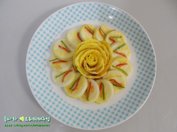 よく焼けたら、キッチンペーパーなどの上に乗せて余分な油を切ります。こうすることで、よりあっさりと上品な味わいが楽しめます。余った卵液で薄焼き卵を作り、バラの花のように巻いて飾ると、さらに美しい盛り付けになり、特別な日のお料理やお客様のおもてなしにもぴったりの、素敵なチヂミが完成します。