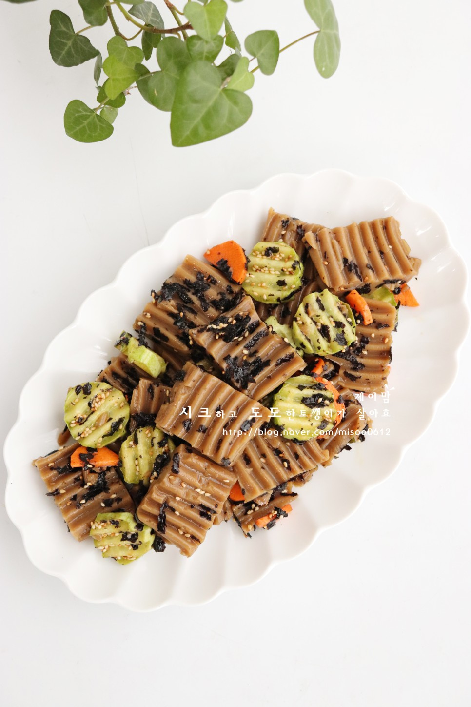 さあ、美味しいドトリムク(どんぐりこんにゃく)の和え物の完成です!もちもちのドトリムクと新鮮な野菜、香ばしい海苔の組み合わせが絶妙なこの一品で、楽しい食事の時間をお過ごしください。