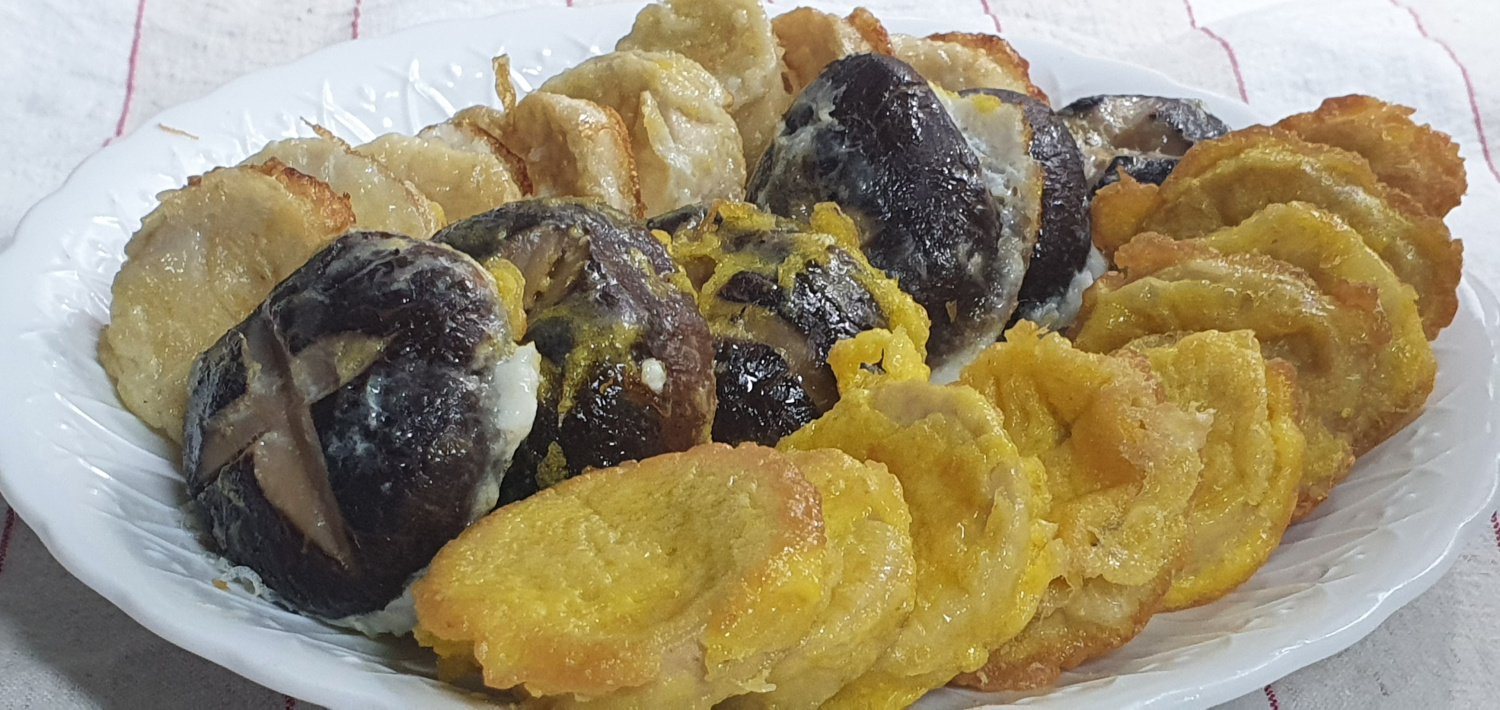 では、きのこに衣をつけていきましょう。切り込みを入れた干ししいたけは、切り込み部分だけに薄く小麦粉をまぶします。傘の部分には粉をつけないことで、きのこの食感と香りを活かすのがポイントです。厚めに切ったエリンギは、全体にまんべんなく小麦粉をまぶしてください。こうすることで、卵液がしっかりと絡み、より美味しく焼き上がります。