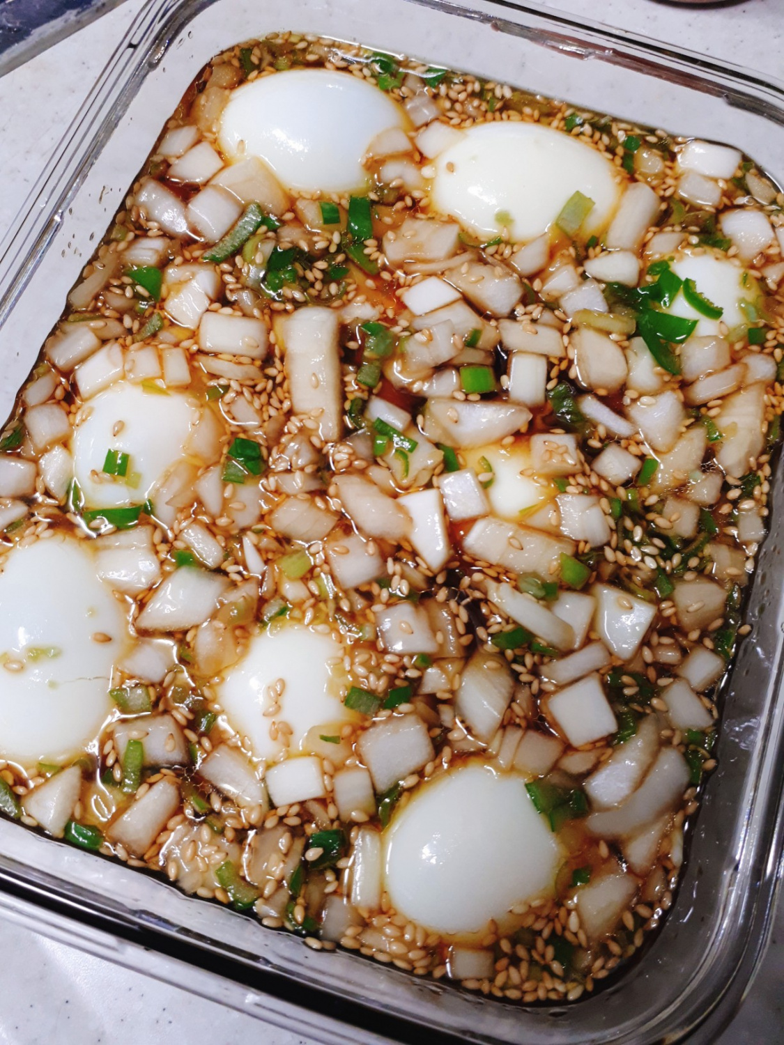 漬け込んで完成:保存容器に並べた半熟卵の上に、作った調味料を卵がひたるくらいまで注ぎます。蓋をして、冷蔵庫で最低1~2日間漬け込めば、味がしっかり染み込んで、より一層美味しくなります。ぜひ、できたてのマヤッカンジャンをお楽しみください!