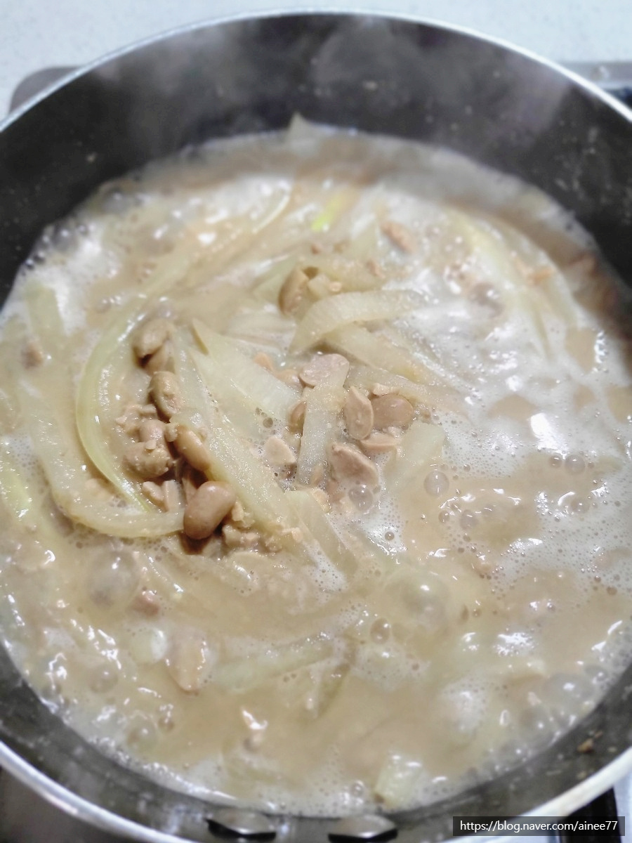 チョングッチャンを溶かした米のとぎ汁に、薄切りにした玉ねぎと切った大根をすべて加えます。強火にかけて沸騰させ、大根が柔らかくなるまで煮込みます。