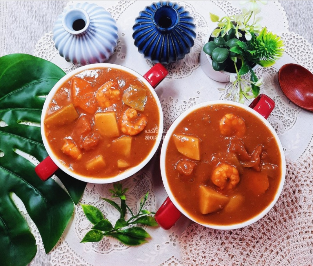 美味しくて栄養満点のエビとトマトのカレーが完成しました!プリプリのエビの食感と、トマトの爽やかな酸味が絶妙にマッチし、食欲をそそる素晴らしい一皿です。温かいご飯の上にたっぷり乗せて、美味しく召し上がってください。キムチを添えるだけで、満足感のある食卓が完成しますよ。