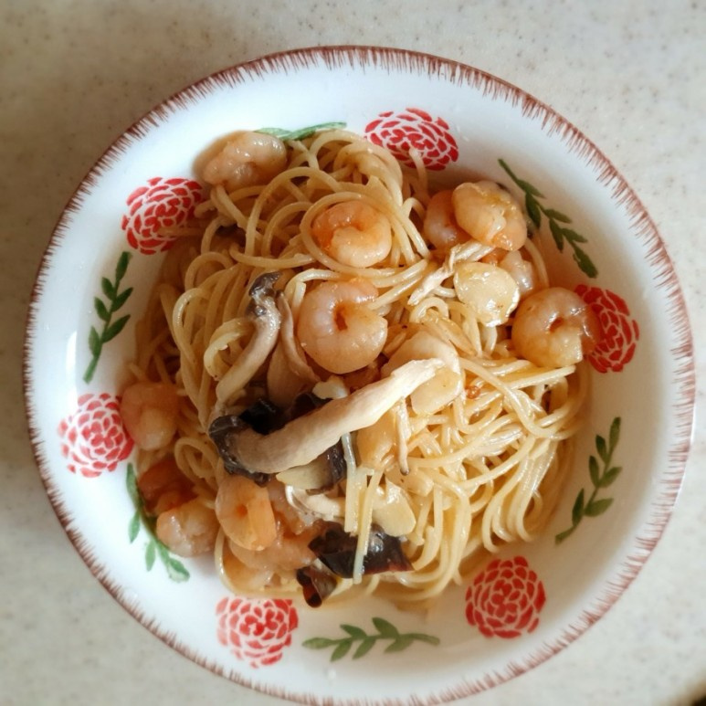 じゃーん!美味しそうなエビのアヒージョパスタが完成しました。見た目からして食欲をそそりますね?