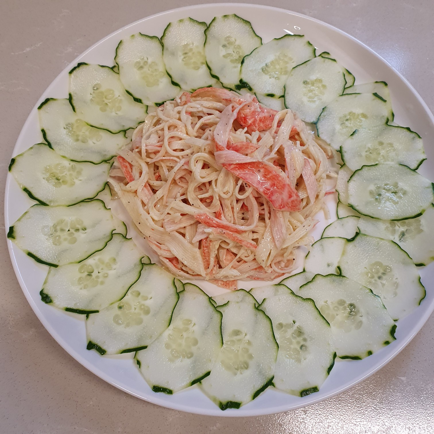 最後に、サラダを美しく盛り付けます。大きめの皿の中央に、ほぐしたカニカマをきれいに盛り付けます。次に、縁に沿って薄くスライスしたきゅうりを重ねるようにして、見た目良く並べます。きゅうりを2列重ねて並べると、より豊かで美しい盛り付けになります。食べる際は、きゅうりの上にカニカマを乗せて一緒に食べると、味の調和がとても良いです。