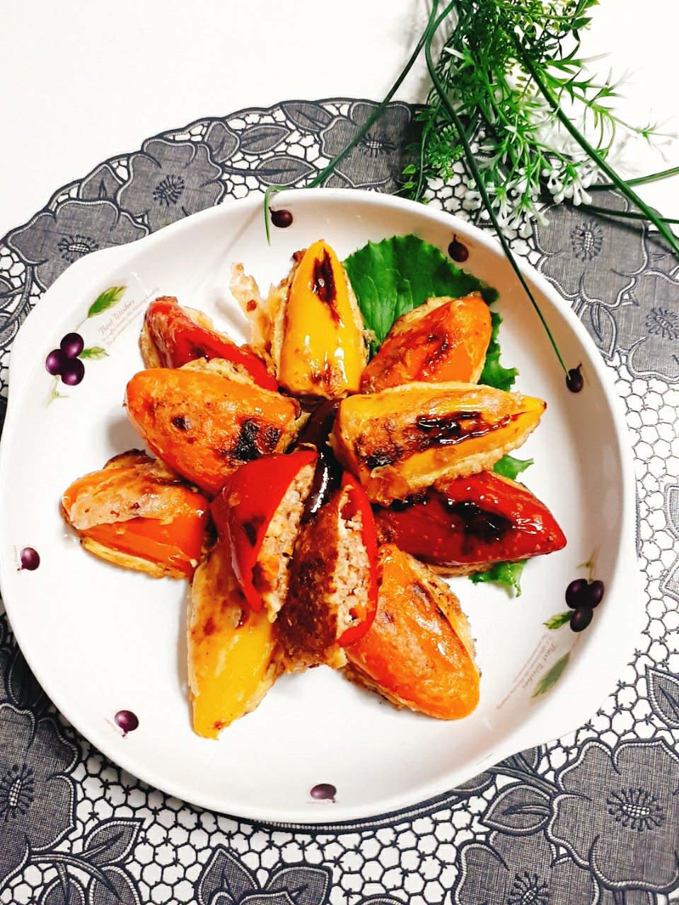 準備したサンマ、豆腐、野菜チヂミの生地を、スプーンや小さなヘラを使って、ミニパプリカの空洞部分に丁寧に詰めてください。生地を詰めすぎると、焼いている間に膨らんでしまったり、流れ出てしまったりすることがあるので、パプリカの形を少し超えない程度に、適量を詰めるのがコツです。