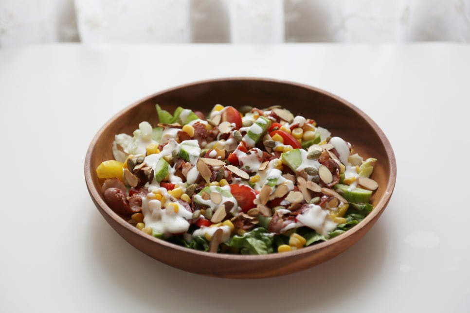 新鮮な野菜に、香ばしいベーコンと甘いコーンをたっぷりトッピングし、爽やかでヘルシーなギリシャヨーグルトドレッシングをかけた美味しいサラダです。暑い夏の日、食欲がない時でも、しっかり満足感を得られながらも、体は軽やかに保てるダイエットメニューにぴったり!美味しさと健康、両方を叶えるレシピをご紹介します。
