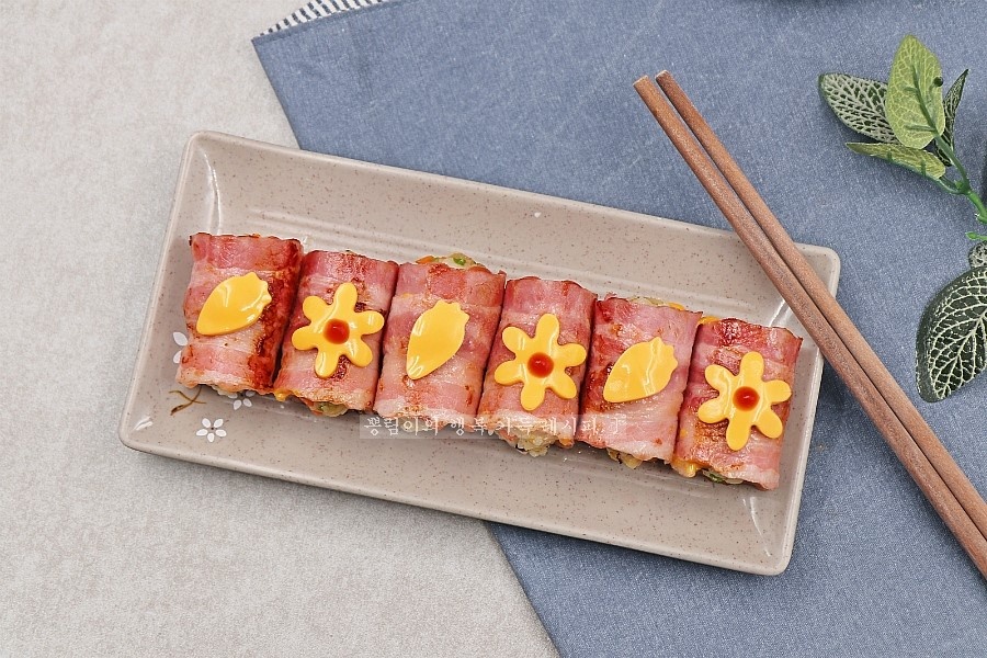 美味しそうに焼きあがったベーコン巻きおにぎりを、お皿にきれいに盛り付けます。お好みで、可愛い型で抜いたチーズを上にちょこんと乗せると、お子様はさらに喜んでくれるはずです。どうぞ、召し上がれ!