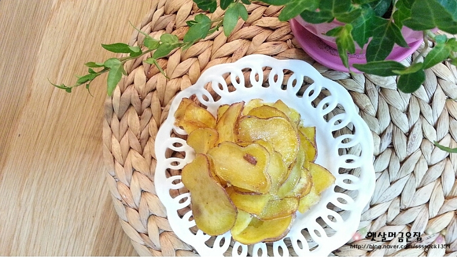 はい、これで簡単なのに香ばしくて甘いさつまいもチップスの完成です!この方法はさつまいもだけでなく、じゃがいもの時期にも、じゃがいもを薄くスライスして同じように揚げれば、美味しいポテトチップスが作れますよ。本当に簡単ですよね?温かいお茶やコーヒーと一緒にどうぞ。