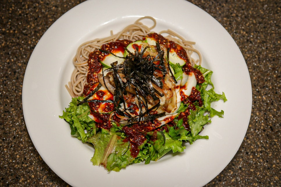 カリカリ豚バラと香ばしい蕎麦の絶妙ハーモニー、サムギョプメミルサラダ