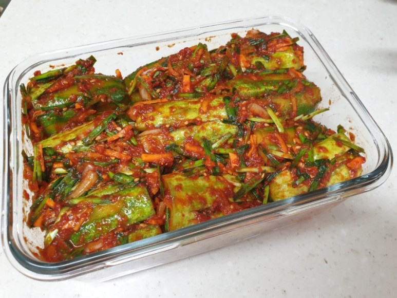 これで全ての準備が整いました!水気をしっかり切ったきゅうりをボウルに入れ、準備したヤンニョムをきゅうりの切り込みの間に丁寧に詰めていきます。詰めすぎると外にこぼれてしまうことがあるので、適量を入れるのがコツです。丁寧に詰めていくと、見た目も美しいオイソバギが完成します。