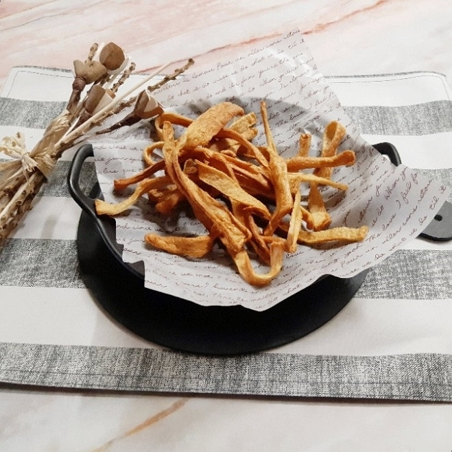 このようにカットしておくと、普段のおやつとしてつまむのにとても便利です。暑い夏には、他のお菓子が一切不要になるほど!準備したお魚のすり身を、クッキングシートを敷いたエアフライヤーのバスケットに並べて入れてください。重ならないように広げると、よりカリッと仕上がります。
