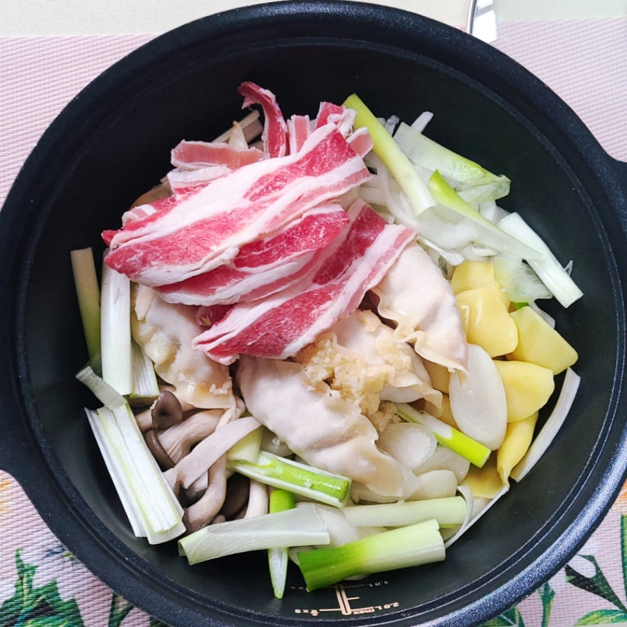 鍋を用意します。鍋の底に、ヒラタケ、エノキダケ、玉ねぎの薄切り、じゃがいものスジェビ、トックク떡を彩りよく並べ入れます。(もし戻した韓国春雨があれば、この段階で一緒に加えると、さらにボリューム満点の鍋になります。)