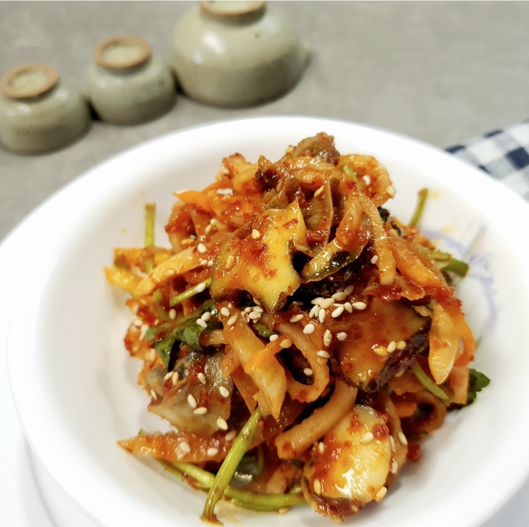 大きめのボウルに、準備した野菜(セリ、大根、玉ねぎ、人参)を先に盛り付け、その上に切ったサザエの身と斜め切りにした青唐辛子を乗せます。最後に、作ったソースを全てかけ、手で優しく和えます。ソースが全体に均一に絡むように、丁寧に混ぜてください。