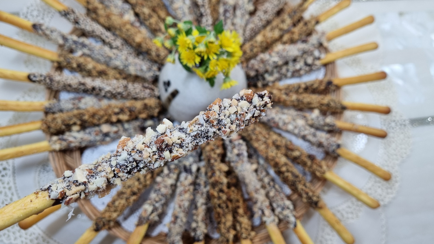 いよいよコーティングの時間です!準備したチーズスティックを、溶かしたチョコレートに浸し、菜箸やフォークを使ってチョコレートを全体に均一に付けます。チョコレートが付いたスティックを、すぐに準備しておいた刻みナッツ(アーモンド、クルミ)とごまのミックスに転がしながら、全体にしっかりとまぶしつけます。ナッツがチョコレートにしっかり付くように、軽く押さえてください。