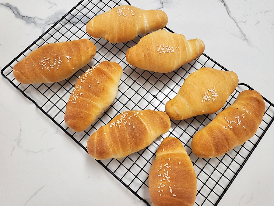 焼きあがったばかりの美味しそうな塩パンは、オーブンから取り出したらすぐにケーキクーラーなどの網に移し、熱い湯気を逃がしながら完全に冷まします。