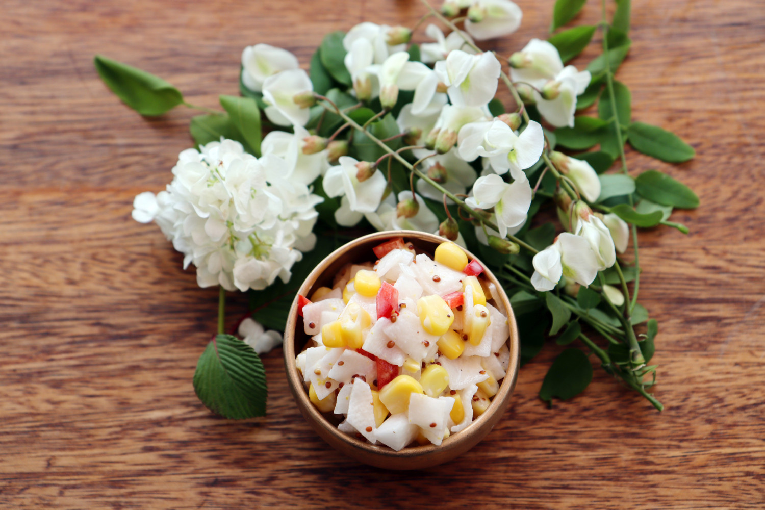 食欲がない時でもペロリと食べられる!キャンプやピクニックで余ったサムムー(酢漬け大根の薄切り)を有効活用して、彩り豊かで美味しいサムムーサラダを作りましょう。サムムーのシャキシャキ感とコーンの甘み、爽やかなドレッシングが絶妙にマッチします。サムムーを使った3品のうちの1つで、調理時間も短く手軽に作れるのが魅力です。