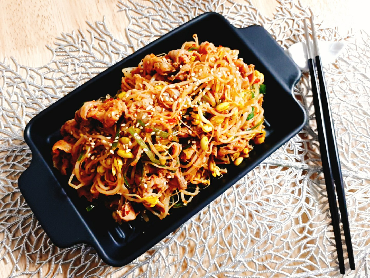 次に、こしょう少々とコチュジャンを、もやしの上に均一に振りかけます。調味料を加えたら、そのまま1~2分ほど置き、もやしが少ししんなりするのを待ちます。その後、菜箸やヘラを使って、もやしを優しくほぐすようにしながら、豚バラ肉と全体が均一に混ざり合うように炒め合わせます。火加減は引き続き中火でお願いします。(お子様と一緒に食べる場合は、コチュジャンは省略するか、量を減らしてください。)