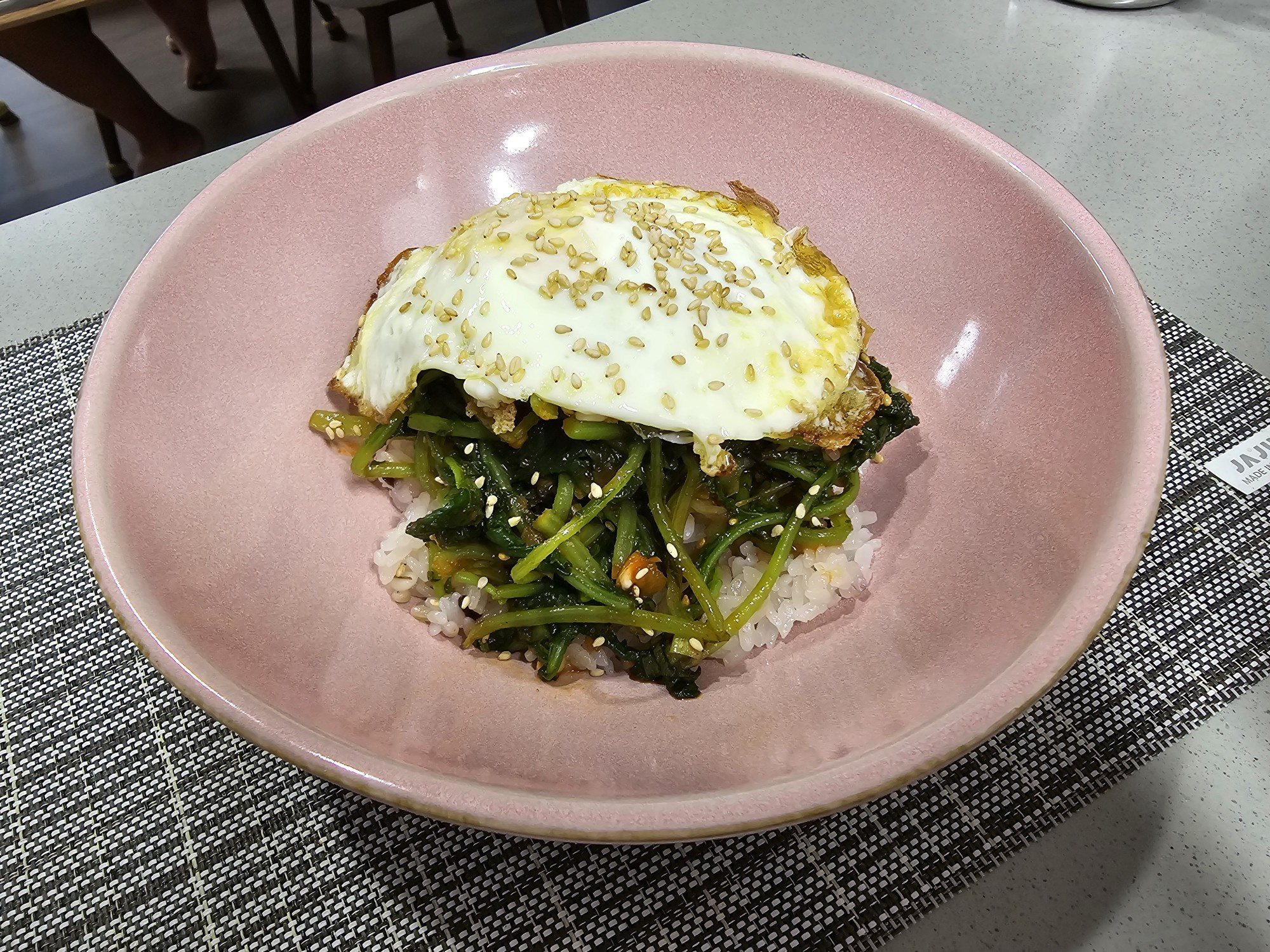 お母さんの畑で採れた新鮮なよもぎを使って、シャキシャキでさっぱりとしたよもぎナムルを作り、ご飯泥棒と呼ばれるほどの絶品ビビンバに仕上げました。食欲がない時にもぴったりです!