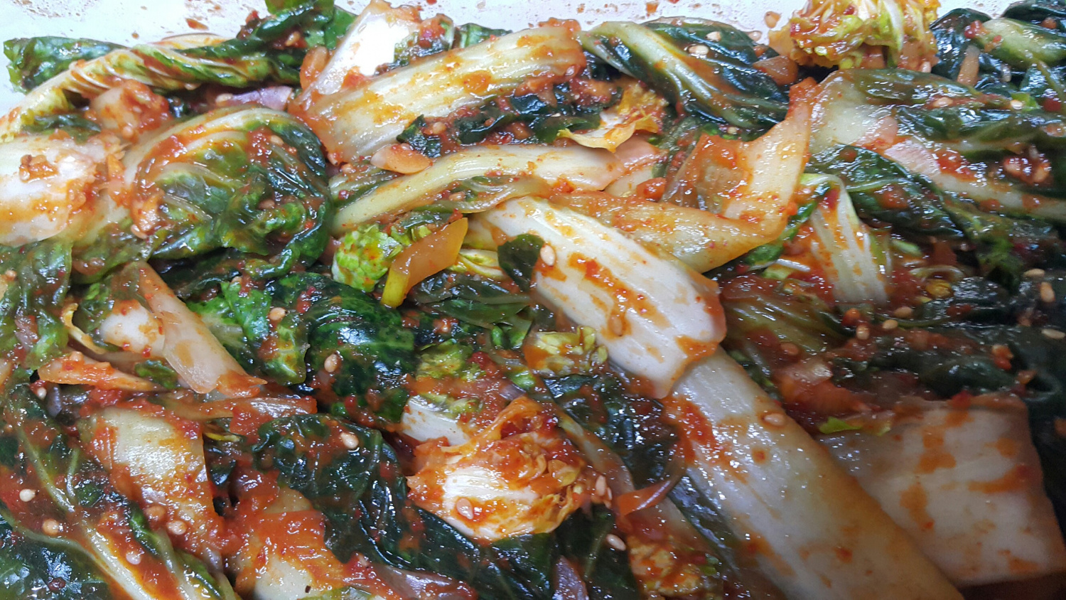 和え物の調味料(カナリエキス大さじ5、쥐눈이콩 간장大さじ3、ツナエキス大さじ3、コチュカル大さじ5、砂糖大さじ3、梅エキス1おたま)を混ぜ合わせます。そこに、準備しておいたニンニクのみじん切り大さじ3と生姜のみじん切り大さじ1も加えます。最後に、お好みで炒りごまを散らしてください。ただし、香ばしいごま油は、後で仕上げに加えるために取っておきましょう。