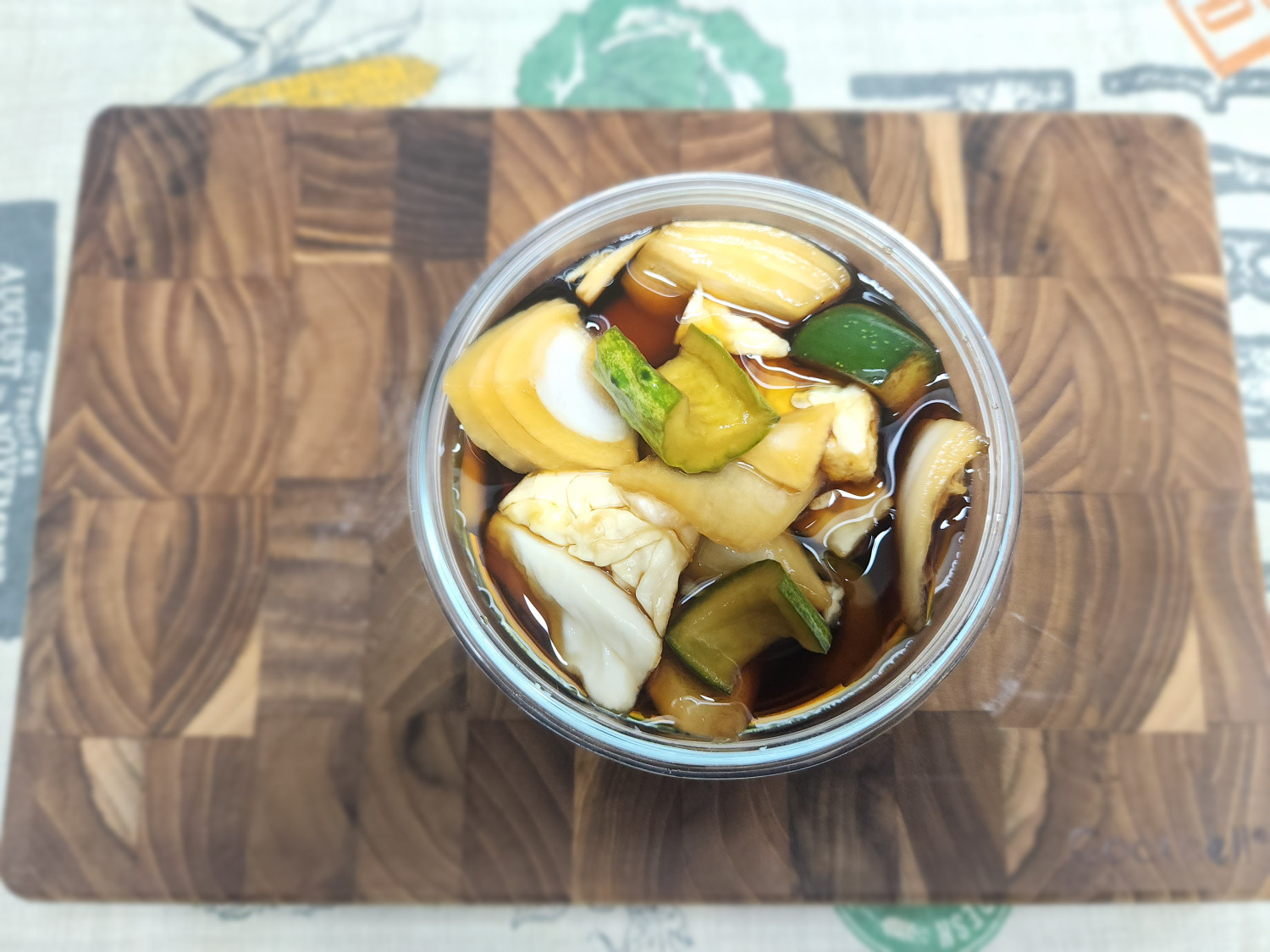 準備した容器(ガラス瓶やプラスチック容器)に、切った玉ねぎ、キャベツ、きゅうりをすべて入れます。次に、切った野菜がすべて浸るくらいの量のピクルス用醤油を注ぎます。蓋をしっかりと閉め、常温で半日から1日ほど置くと、野菜に味が均一に染み込み、すぐに食べられるようになります。冷蔵庫で保存すれば、より長く美味しく楽しむことができます。